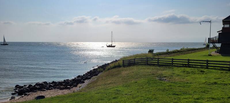 Wij zorgen er verder voor dat de boot om een uurtje of half één klaar is voor vertrek. De kinderen komen rond die tijd ook weer binnenwippen en we gaan meteen op pad. Deze keer zetten we met een (soms dikke) windkracht 4 Bft afwisselend voor de wind en halve wind koers terug naar Lelystad. En dat gaat als een speer! Hierbij hebben we weer twee reven in het zeil, net als gisteren. We halen regelmatig een dikke 8 knopen. In iets meer dan vier uur tijd meren we weer aan in Lelystad. Daar verzamelen we - na een supergezellig weekend - onze spullen, ruimen de boot op en gaan weer op huis aan.