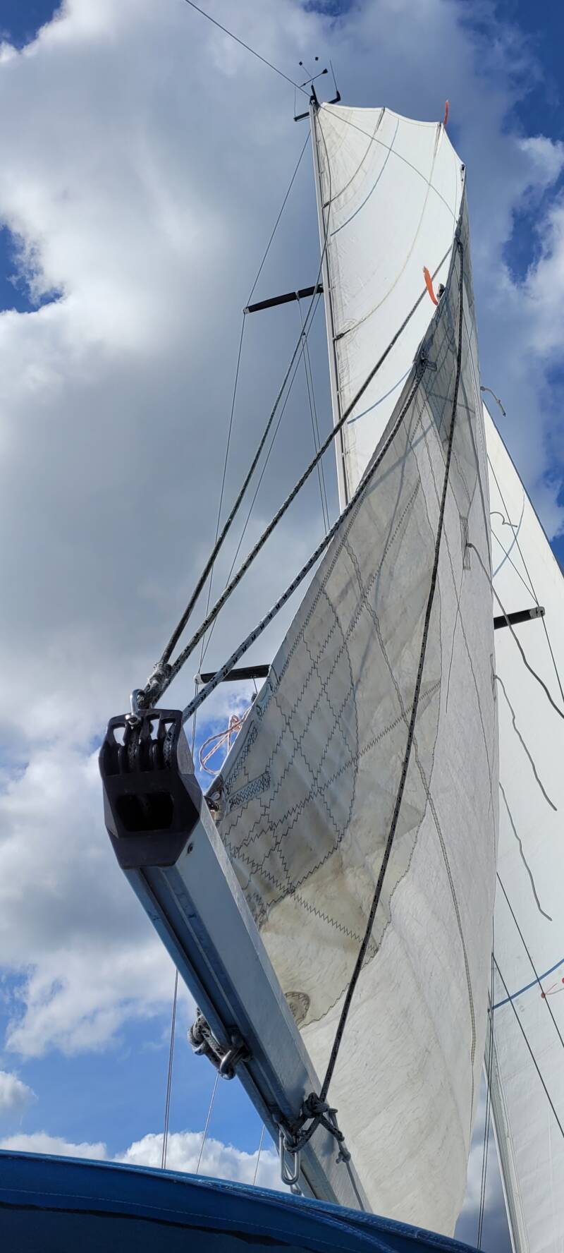 Na een relaxte schutting varen we achter het dijkje door tot aan de derde doorgang naar het grote water. Ondertussen gaan we twee acties ondernemen. De eerste is het fok hoger in de voorstag hijsen. Laatst is deze namelijk een stukje gezakt. Dit euvel is snel verholpen. De tweede actie is het grootzeil, deze ligt nog in dubbel gereefde vorm op de giek. Even goed opletten welke lijnen allemaal los moeten, zodat we het grootzeil weer in zijn geheel kunnen hijsen. En ja, je kent dat wel, toch een van de vele lijntjes vergeten los te zetten... Na wat haperingen bij het hijsen staat het grootzeil gelukkig toch weer fier in de mast en kunnen we het Markermeer opdraaien.