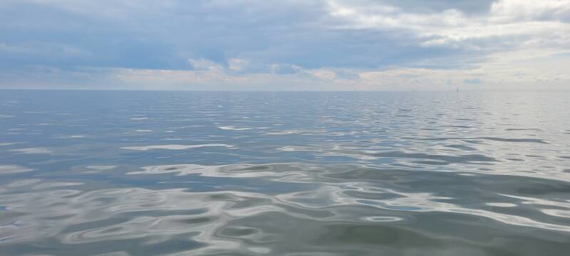 Het is over het algemeen bewolkt, maar droog qua regen en zeer nat qua overkomend water. Nadat een paar keer het gehele dek tot aan de kuip is overspoeld, ziet Paul Michèl plotseling dat we zijn vergeten om het dakluik boven ons bed helemaal dicht te doen. Deze staat nog op een nachtelijke kier. Je raadt het al... Het hele bed en en alle spullen die erop liggen doorweekt. Ai, dat was niet zo'n strakke actie! In de haven van Lelystad maar eens rustig kijken wat de schade precies is.