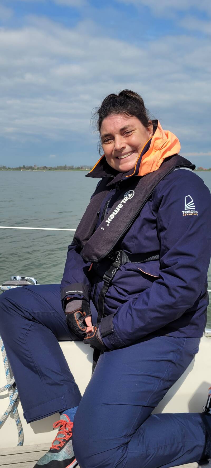 Ondanks een behoorlijk wolkendek varen wij eigenlijk constant in het zonnetje. Dat is maar goed ook, want het is toch behoorlijk frisjes. Renata verruilt haar fleece en jas voor de zeilfleece en zeiljack en even later doet ze toch ook maar die zeilbroek aan. Zonnebril op tegen zon en niet te vergeten wind en de outfit is compleet.