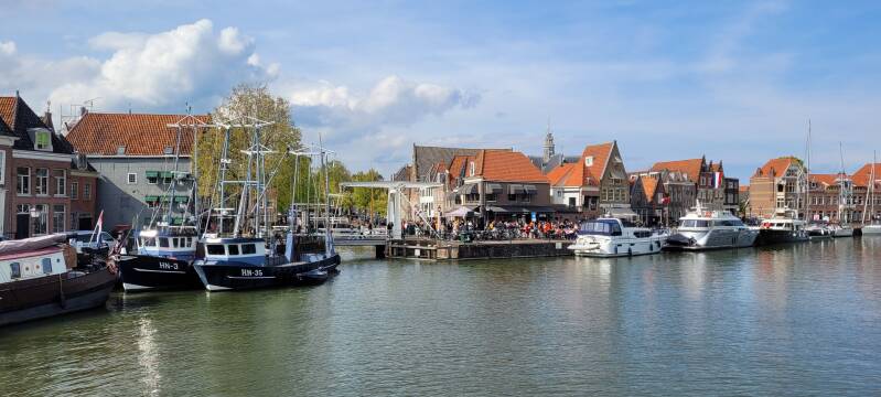 Vanmorgen toen we buiten kwamen, viel het ons al op dat het zo wit was buiten. Het deed qua licht heel winters aan, terwijl de temperatuur wel zacht was. Ook op het water ervaren we dit zo, terwijl er toch een behoorlijke grijze lucht overtrekt. Het levert wel mooie plaatjes op en helaas ook nog een paar spetters. Gelukkig laten we bij de hoek richting Hoorn de bewolking achter ons en dan zitten we heerlijk in het zonnetje. Dat levert een geweldige entree op bij het naderen van Hoorn. Al snel komt de muziek ons tegemoet. Hier wordt duidelijk wel Koningsdag gevierd!