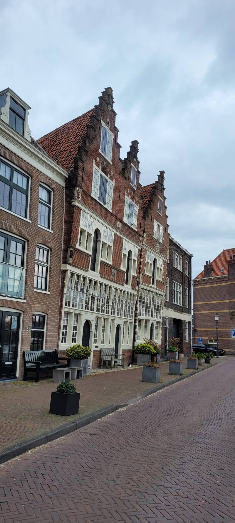 Wat ons overigens opvalt is dat Hoorn veel oude panden heeft staan waarvan de gevel flink uit het lood staat. Het lijken er zelfs beduidend meer te zijn dan in Enkhuizen. Tijd om eens te gaan googlen of hier meer over te vertellen valt. En ja, dat is er zeker. Dit fenomeen van naar voren hellende gevels heet 'op vlucht bouwen'. Het is een bouwstijl die lange tijd populair is geweest. De echte reden is niet bekend. Vermoedelijk is het meest aannemelijk dat het komt, doordat in de Middeleeuwen huizen trapsgewijs werden opgebouwd, waarbij elke verdieping iets uitstak boven de verdieping eronder. Deze huizen waren toen nog van hout. Toen het verplicht werd om huizen van steen te gaan bouwen, zijn in verband met kosten en gemak vaak stenen gevels tegen de oude houten gevels aangeplakt. Dit kon alleen door deze stenen muur er maar scheef tegenaan te zetten!