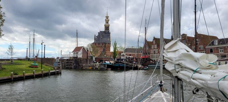 Om 8.30 uur maken wij aanstalten om op te staan. Na het ontbijt lopen we eerst nog even naar de nabijgelegen Hoofdtoren van Hoorn. Het is de blikvanger als je Hoorn vanaf het water nadert. Historisch gezien was het de ideale plek voor een dergelijk bouwwerk. Het lag op het meest zuidelijke puntje van Hoorn aan de toenmalige Zuiderzee en was naast de toegang naar de havens gelegen. De Hoofdtoren is één van de laatste verdedigingswerken in Hoorn die bewaard is gebleven. Met muren van bijna 1,5m dik en schietgaten aan de zeezijde was het dé hoofdschakel bij een vijandelijke aanval vanaf zee. De toren is vernoemd naar de nabij gelegen steiger Houten Hoofd, dat in 1464 gebouwd is.