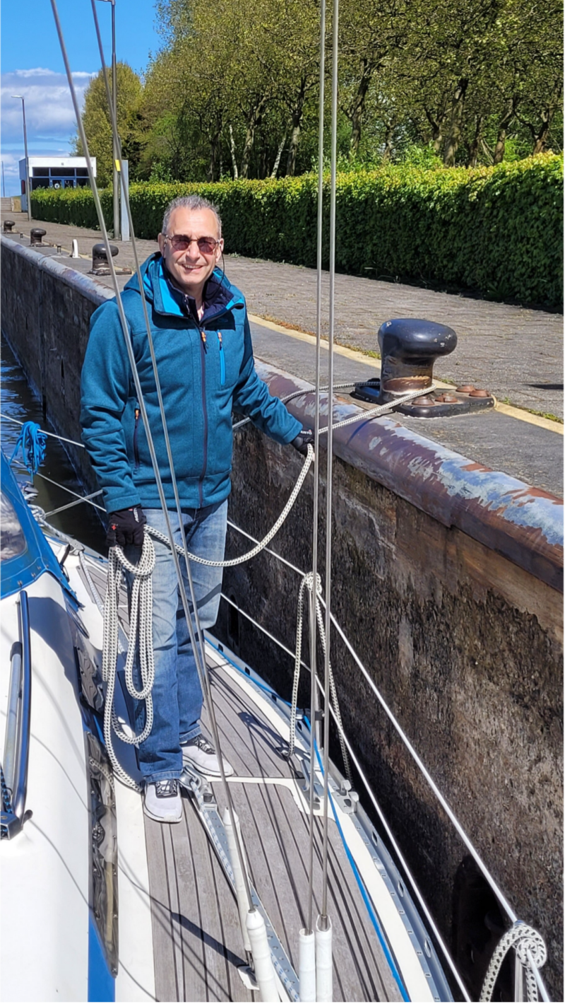 Terwijl Paul Michèl het havengeld betaald, heeft Renata in de tussentijd de boot aan kant geruimd. Lierhendels naar binnen, motorsleutel eruit, stuurhoes over het stuur, enzovoort. De grootzeilval begint meteen al te tikken tegen de mast, dus deze maakt ze ook maar snel weer vast als kraanlijn.