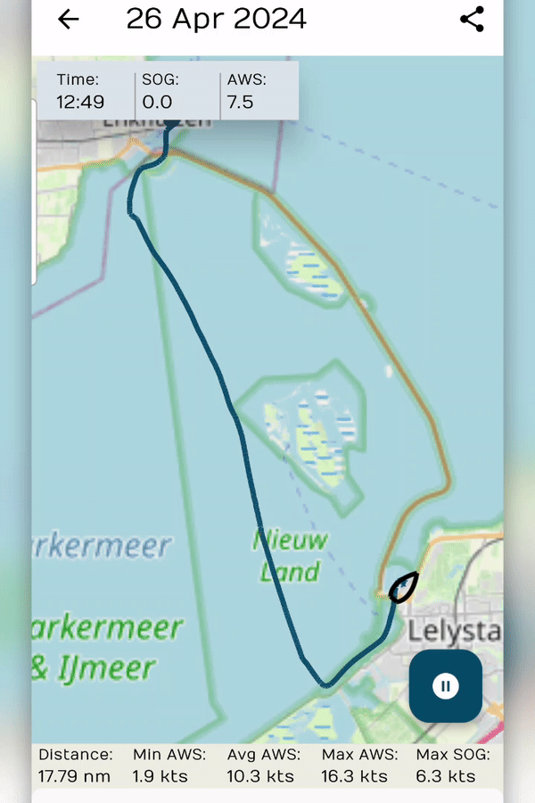 De tracker bevestigt in ieder geval de hoge windsnelheid die we vandaag ervaren hebben op het Markermeer. Met andere woorden: het is niet dat we stoere verhalen proberen te vertellen, maar het is echt wat het is. Al wil ik niet ontkennen dat zeilen - zeker met dit weer - achteraf wel stoer voelt. Toch komen we liever geen windkracht 8 Bft tegen.