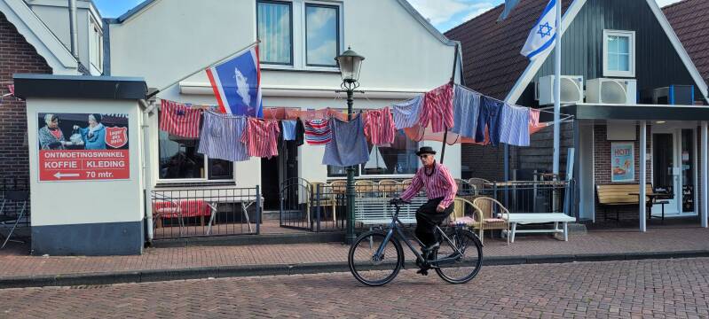 Even verderop lijkt onze favoriete pizzeria döner kebab zaak op Urk vervangen te zijn door een Italiaans Pizza & Grill House. Jammer... We lopen verder de dorpsstraatjes in. Het feestgedruis moet nog een beetje op gang komen, maar de straten zijn al versierd met waslijnen met vlaggetjes of Urker klederdracht eraan. Er zijn ook oude ambachten te zien, zoals het knopen van visnetten. Veel Urkers zitten voor hun huis in klederdracht. Bij de Bethelkerk speelt de plaatselijke fanfare een deuntje. We lopen door de smalle achterafstraatjes waar veel gezinnen druk zijn met de laatste voorbereidingen voor het feest om daarna snel om te kleden in klederdracht en mee te gaan feesten. Bij de botterhelling komen we weer uit bij de Westerhaven. Hier wordt volop vis gerookt en kibbeling gebakken. Gisteravond waren ze ook al druk met het roken van zalm.
