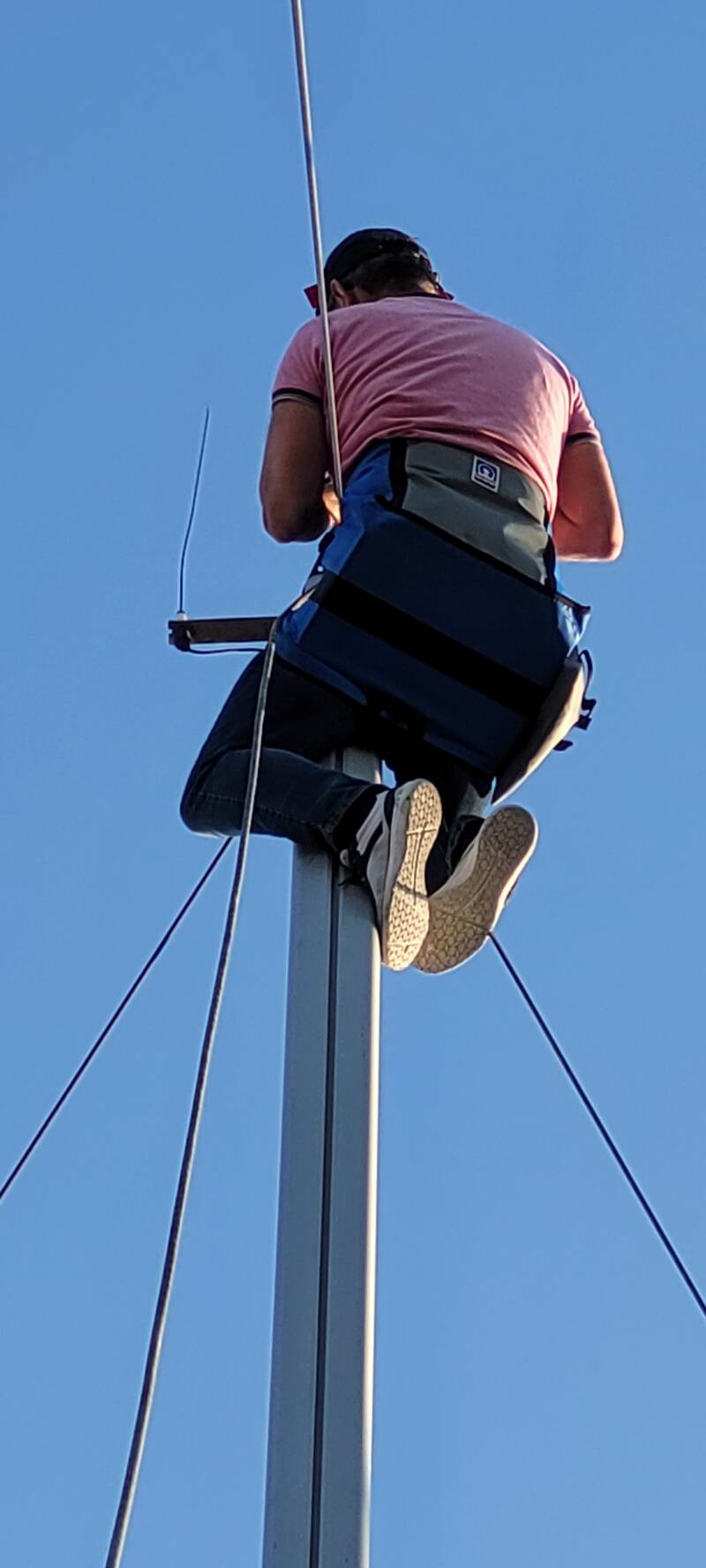 Paul Michèl brengt het bootsmanstoeltje in gereedheid. Renata zal hem aan de grootzeilval met de elektrische lier naar boven hijsen. Zo gezegd, zo gedaan. Boven vraagt Paul Michèl vrijwel direct om een rechtsomkeert. Eerst was het plan om een nieuw katrolletje te monteren, maar het lijkt handiger om te kijken of de nieuwe lijn door het huidige katrolletje de truc doet. Het proberen waard. Renata hijst Paul Michèl weer naar de eerste zaling en in een mum van tijd zit de nieuwe rode vlaggenlijn op zijn plek.