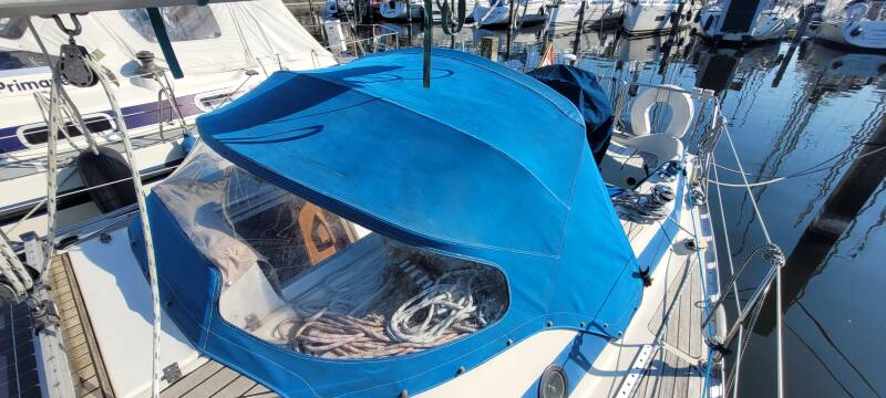 Ondanks het - door het gebrek aan wind - een soort van luierdagje in de zon is geweest, zijn we aardig brak na aankomst. Eerst maar eens even bijkomen met een hapje en een drankje in de schaduw van de kuip. Dat helpt! Na een tijdje besluiten we nog wat klusjes aan te pakken. Paul Michèl treft voorbereidingen om klusjes in de mast te gaan doen, terwijl Renata ondertussen met de groene zeep en een borstel de buiskap onderhanden neemt. De groene zweem op het blauwe doek kunnen we beiden niet langer aanzien. Gezien het groene water dat er vanaf druipt, heeft deze poetsbeurt wel effect. Het naspoelen met de slang is geen overbodige luxe, ook voor het naastgelegen dek. Nu afwachten of de buiskap mooier opdroogt!