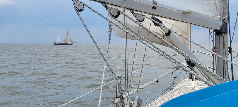 - Gezien de noordnoordoosten wind blijkt dit al snel toch geen haalbare koers. Dus meteen maar weer overstag en het fok naar stuurboord halen.