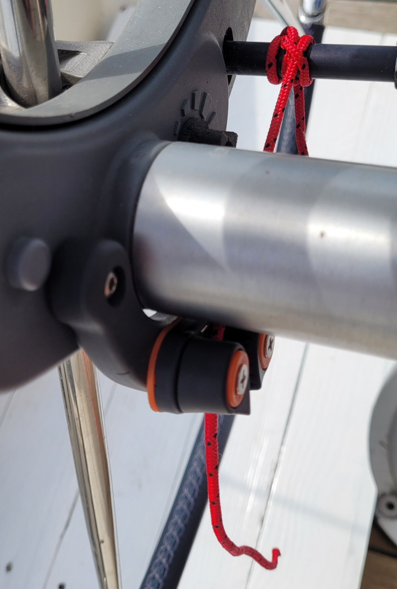 Paul Michèl begint aan zijn eerste klusje. Hij gaat een lijnklem maken op de hendel van de stuurautomaat, zodat deze niet steeds los gaat als de stuurautomaat in werking is. Een paar weekenden geleden was het echt om gek van te worden. De hendel kwam zo vaak los! Met deze klem en een lijntje voorkomen we dit euvel. Het is een variant op het gebruik van een elastiek om de hendel op zijn plek te houden.