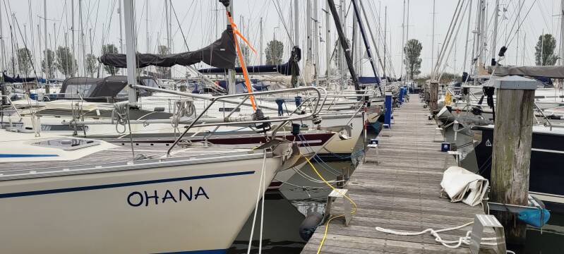 In de haven zijn de hijsdagen begonnen. Het parkeerterrein voor lang parkeren is vrijwel leeg en afgezet met bokken. Op de kant staat een boot, die met de hogedrukspuit wordt schoongespoten alvorens op een bok naar haar winter locatie te worden gereden. Bij de hijsinstallatie ligt de volgende boot al klaar. Zodra de hijsdagen achter de rug zijn, krijgen wij tijdelijk een andere box in de haven. Onze steiger is aan de beurt om vervangen te gaan worden. Voor nu liggen we nog op ons oude vertrouwde plekje.