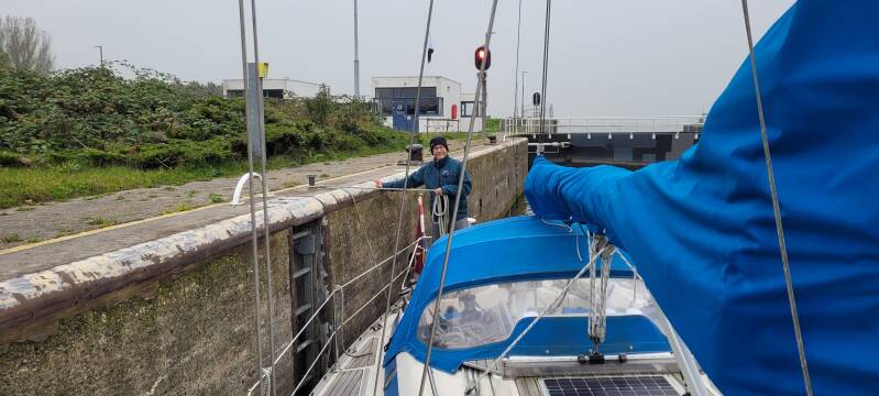 We verlaten de haven in de richting van de Houtribsluizen om te schutten naar het Markermeer. Na oproep op VHF-kanaal 20 wordt ons duidelijk dat we achter het voor ons varende vrachtschip de bakboordsluis in moeten varen. We moeten nog wel even geduld hebben. In de sluis kiezen wij de stuurboordzijde schuin achter het vrachtschip. Het schutten gaat snel. Het vrachtschip kan meteen al uitvaren, want deze kan onder de brug door. Met onze mast moeten we toch beter maar even wachten tot ook de brug open gaat.