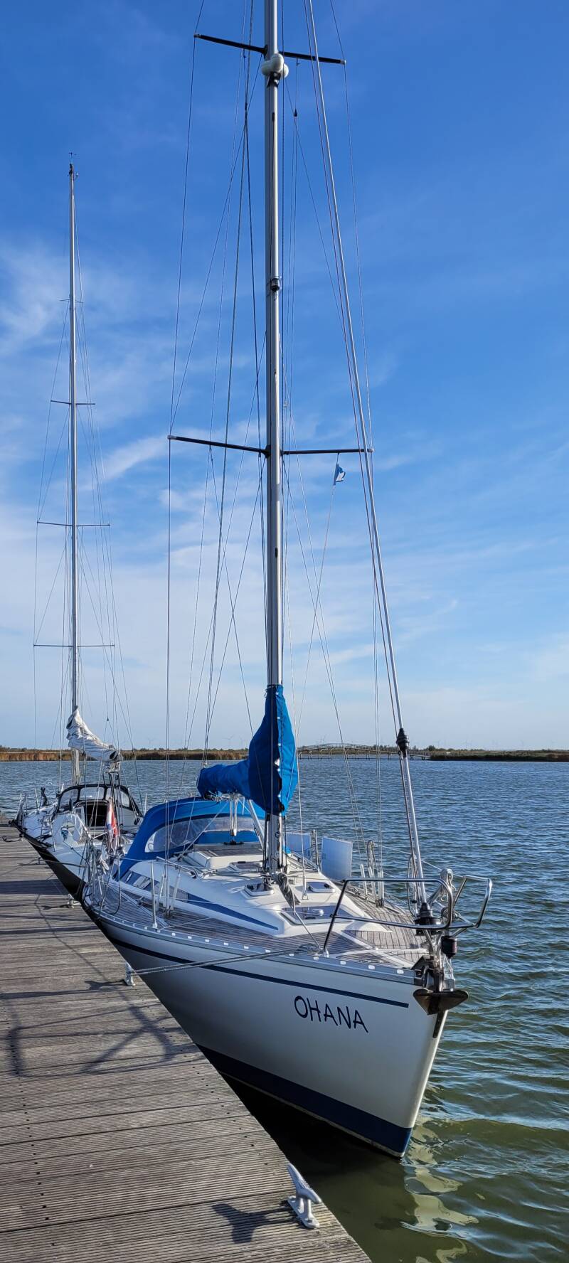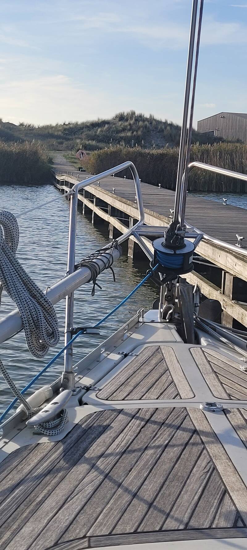 Voor ons blijkt de boot te liggen die twee jaar geleden naast ons lag op Vlieland toen we terugkwamen van de Oostzee. Zij hadden toen een splinternieuwe iPhone in het water laten vallen. Met magneet en duikbril en bellend naar de betreffende telefoon gingen ze op zoek, maar helaas zonder resultaat. Nu komen we hen toevallig hier weer tegen.