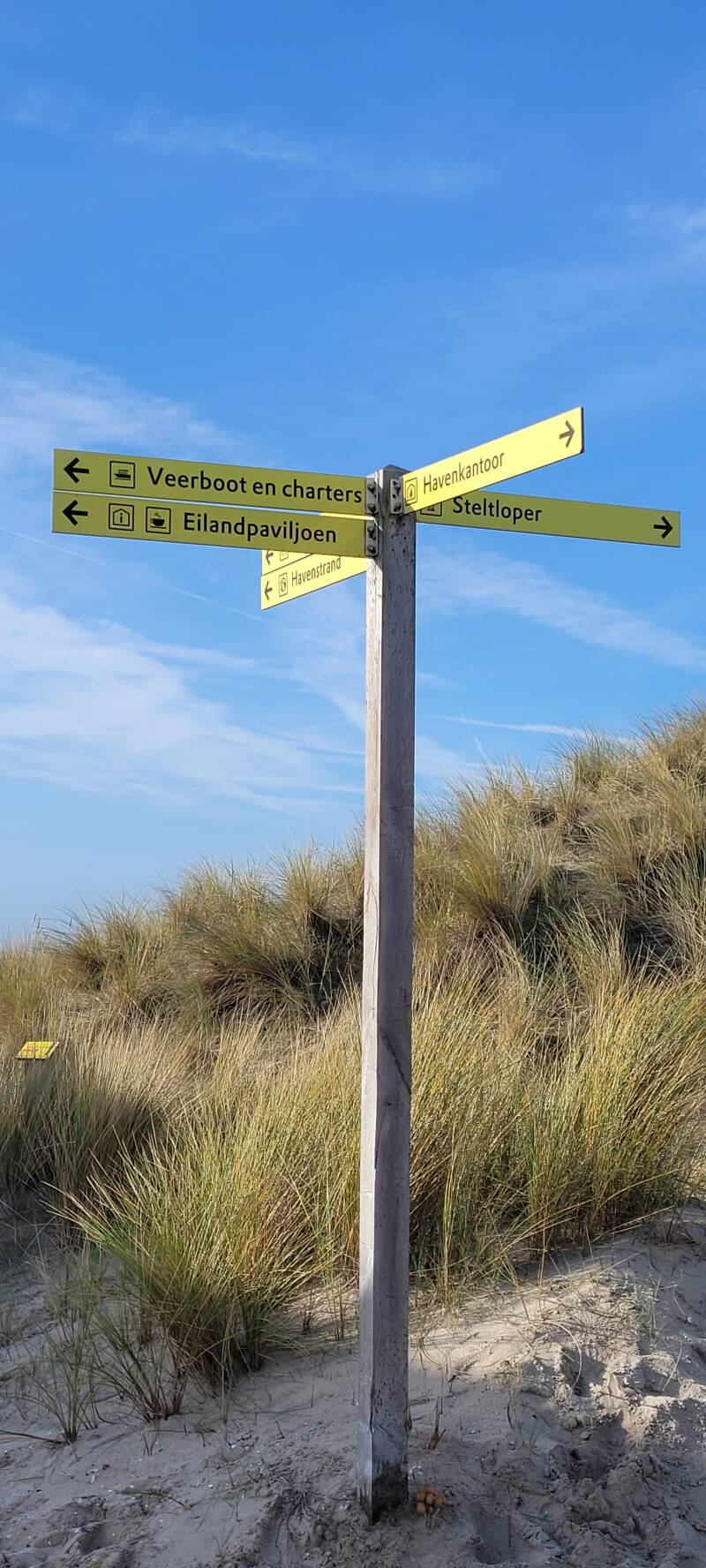Tenslotte nemen we een kijkje bij de aanlegsteiger van de rondvaartboot. De boot die even tevoren aankwam was goed gevuld met zondagse wandelaars. Op de kade staat een leuk informatiebord me tips van de boswachter. Als je geluk hebt, kun je op dit eiland zelfs een zeearend treffen!