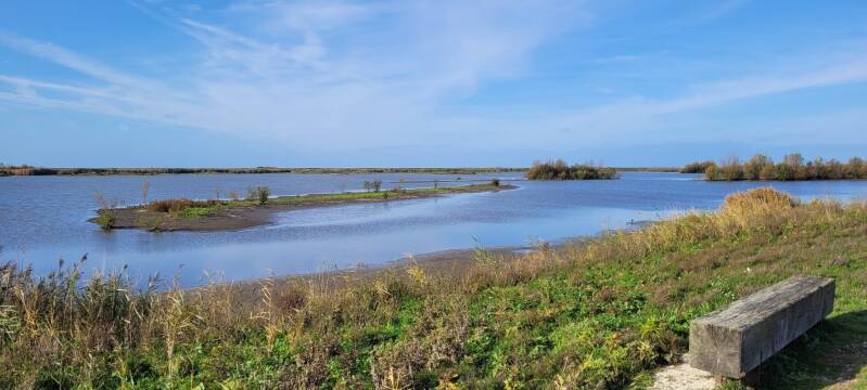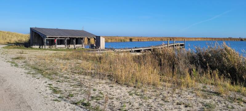 We bestuderen de wandelkaart die bij het paviljoen aan de buitenmuur hangt en kiezen een mooie wandelroute. Het is heerlijk buiten in het zonnetje. Om ons heen moerassige gebieden met foeragerende vogels. Hier en daar kun je een kijkje nemen op een beschut uitkijkpunt. Waar het water de overhand heeft zijn vlonderpaden aangelegd. We genieten volop.