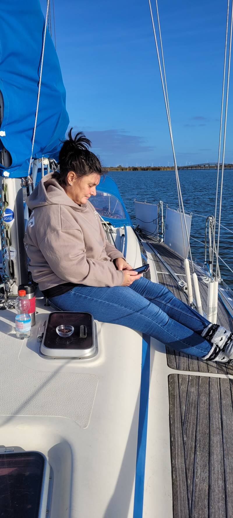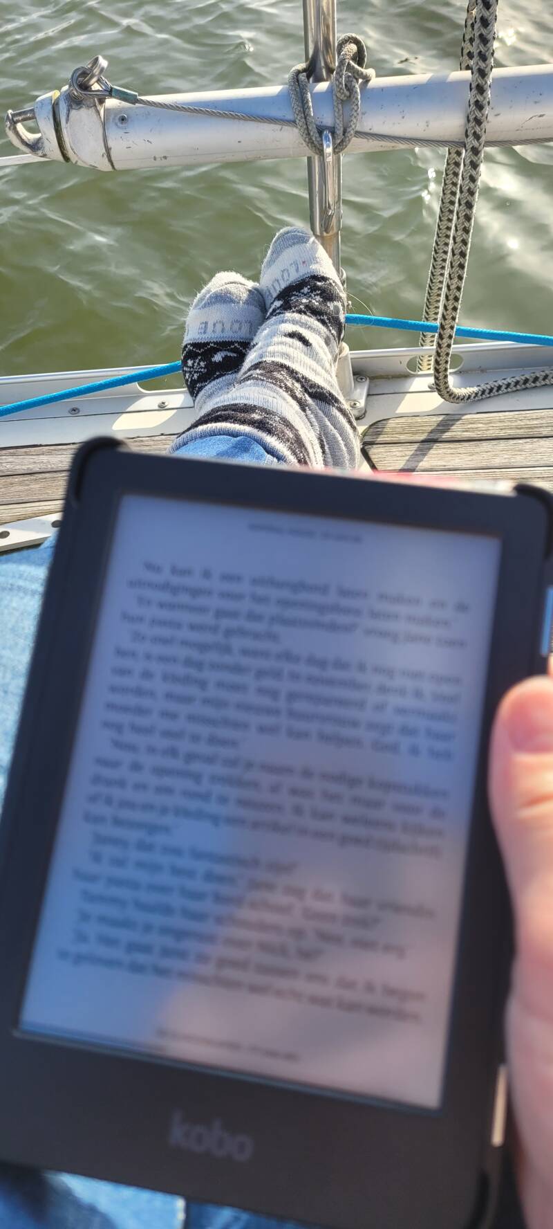 Terug bij de boot gaat Renata met twee dikke truien en huissokken aan op het dek in de zon zitten met een e-reader en wat te drinken bij de hand. Wat is het heerlijk in het zonnetje! Paul Michèl gaat binnen wat dingen doen.