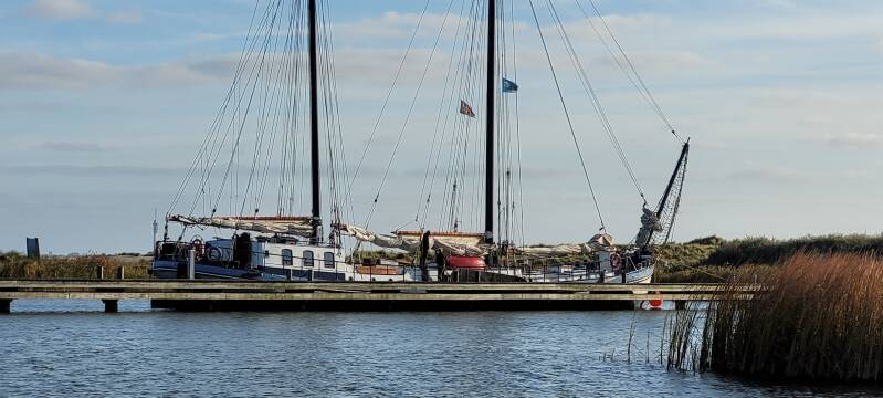 Het is rustig in de haven. De meeste boten liggen aan de stapelsteiger. Aan de bakboordzijde zien wij nog een mooi plekje tussen twee andere schepen. We krijgen een helpende hand en worden vriendelijk welkom geheten op de Marker Wadden. Het is inmiddels vijf uur en al flink aan het schemeren. We dachten in eerste instantie dat het al zes uur was - waar hadden we die tijd dan verloren? - maar de klokken aan boord staan blijkbaar nog op zomertijd. Even vergeten…