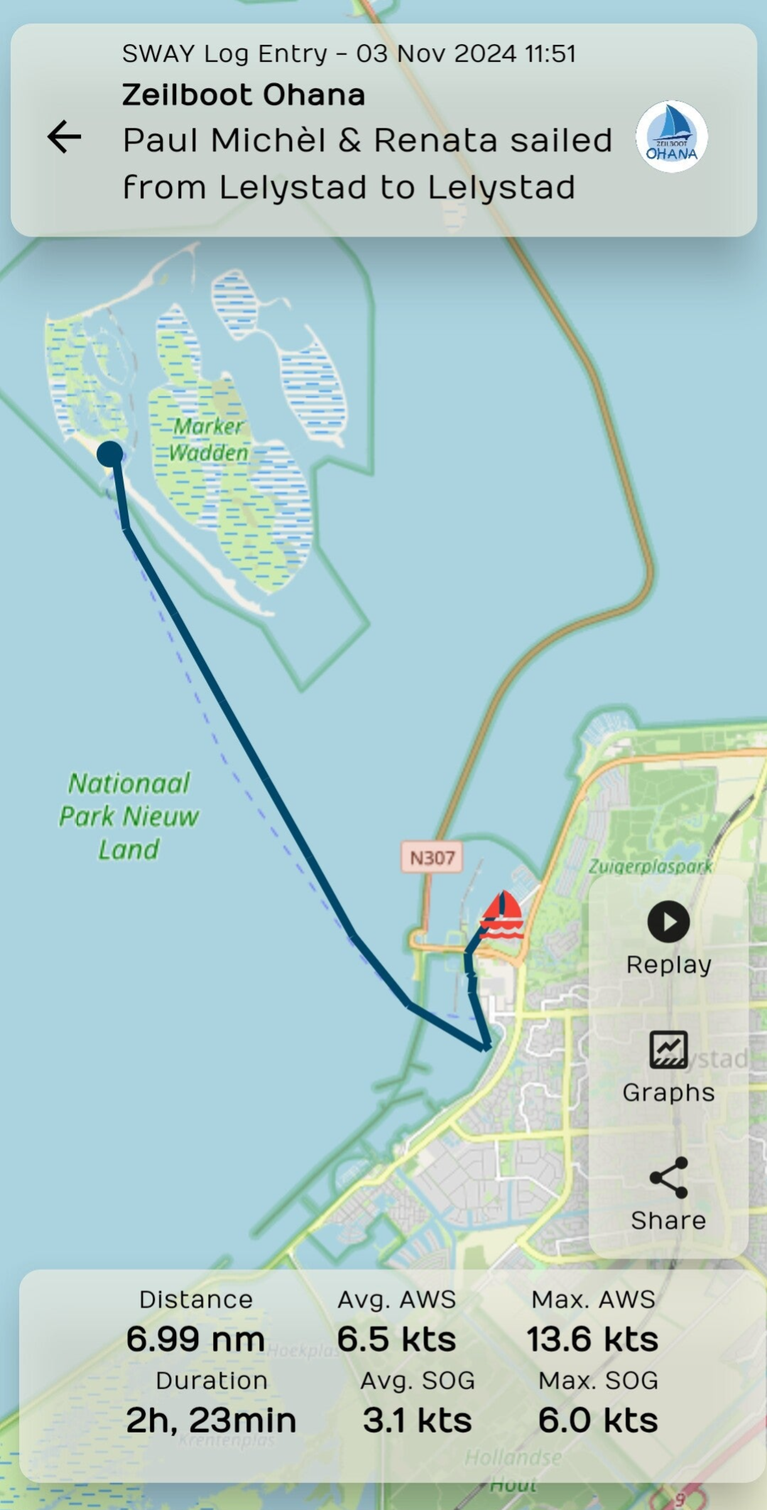 Afstand door het water: 7,4 NM; Duur: 1 uur en 31 minuten; Gemiddelde snelheid: 4,1 Kts