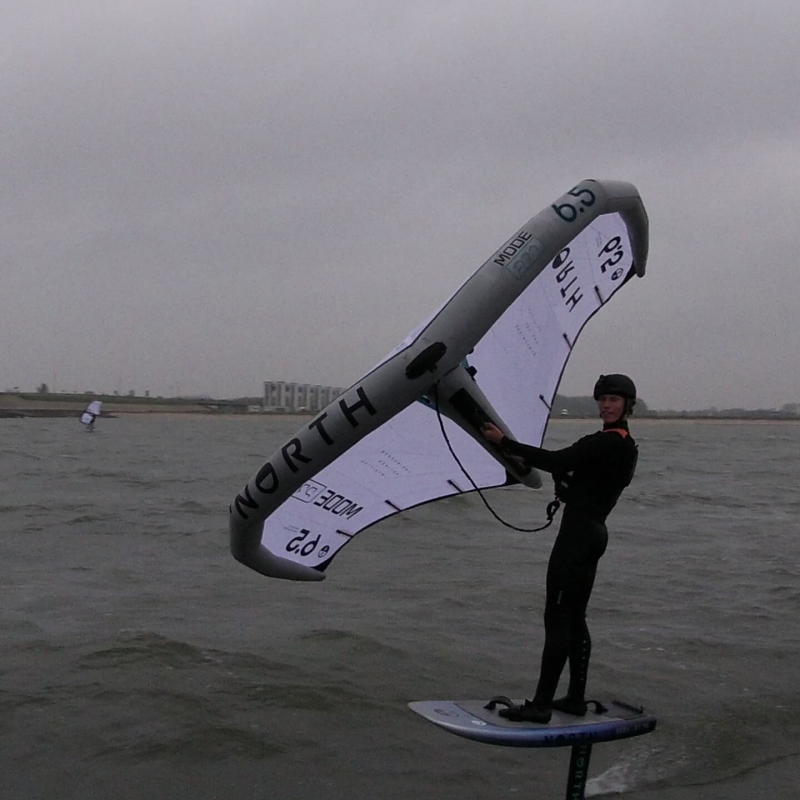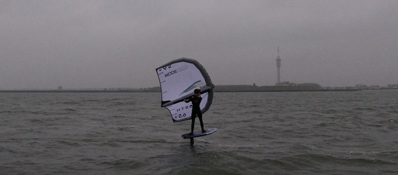 We varen door de opening in de dijk het Markermeer op en zetten koers naar de Marker Wadden. Ondanks een windkracht drie en halve wind in het grootzeil maken we niet echt lekker tempo. We hebben ook niet het fok als extra troef om vooruit te komen, want die zit er (nog altijd) niet op. We laten de motor dus maar een beetje bijdraaien. Voor ons zien we twee wingfoilers. Eentje gaat echt als een speer en komt meerdere keren dicht langs ons heen scheren. Erg gaaf om te zien en we zetten deze jongen op beeld. Het blijkt Felix Drent te zijn, professioneel wingfoiler en Nederlands kampioen 2024. Omdat we het zo leuk vinden, maakt hij nog een aantal ererondjes. Na een tijdje laten we de jongens weer achter ons. De Marker Wadden komen al in zicht.