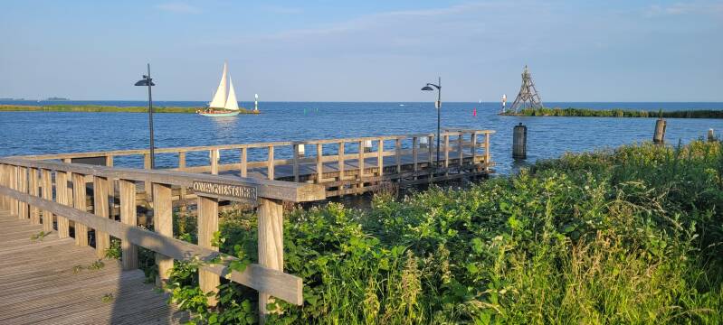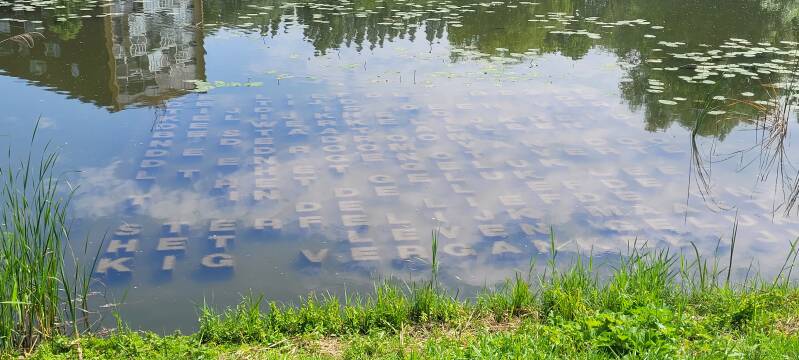 Wat ons gisteravond nog niet was opgevallen, doet dat nu wel. Aan het pad langs de haven ligt aan de rechterzijde een meertje. Ons oog valt op een gedicht dat op letters net onder de waterlijn is geschreven. We houden even stil om dit gedicht te kunnen lezen.
