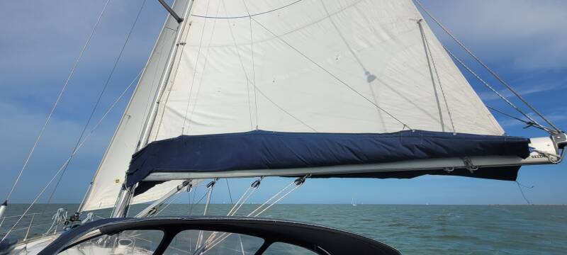 We verzinnen ook een list om de fokkenhoes goed om het fok te kunnen dichtritsen. De vorige keer hebben we de rits wel dicht gekregen, maar afgelopen vrijdag kregen we de hoes er niet meer zomaar vanaf. Normaal gesproken zet je de lijn van de fokkenhoes los, rits je de hoes een stukje open en schuif je de hoes een stukje omlaag, zodat je de rits weer een stukje open kunt ritsen, etc. Omdat we de hoes vrijdag niet meer naar beneden konden schuiven, moesten we met de gennakerlijn aan de gang om de rits ver boven onze reikwijdte - ter hoogte van de knopen van de fokkenschoot - weer open te krijgen. We begrijpen nu wel dat de vorige eigenaar de fokkenhoes eigenlijk nooit gebruikte, maar voor behoud van de fok, willen wij deze toch wel gaan gebruiken.