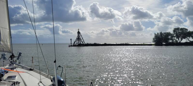 Buiten de haven hijsen we gelijk het grootzeil en draaien vervolgens richting Marken. Meteen speren we er met meer dan 7 Kts vandoor. We zijn nog steeds elke keer verwonderd dat we zo snel gaan. Als we voor Marken bij de scheidingston bakboord uitgaan varen we verder voor de wind en loopt de snelheid terug naar rond de vijf knopen. Zo varen we verder tot voor Volendam waar we de Gouwzee verlaten en het open water van het Markermeer op varen. Het is echt heerlijk nazomer weer, een zonnetje en heerlijk zachte temperaturen. Gewoon nog een keertje lekker de korte broek aan en met korte mouwtjes in de wind.