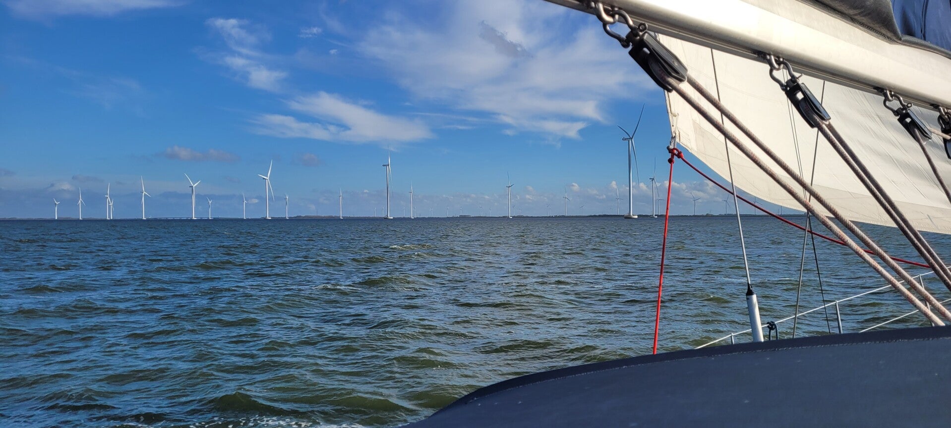Het laatste gedeelte vanaf de hoek van de dijk in de richting van de Houtribsluizen moeten we opkruisen tegen de wind in. We komen mooi uit met onze rakken en we ruimen vlak voor de haven de zeilen op. Gelukkig is het geen probleem om het grootzeil te laten zakken. Deze moeten we wel meenemen om te laten repareren. We varen onze vertrouwde haven binnen en draaien achteruit richting onze plek aan de K-steiger. Weer even wennen met aanleggen, maar ook dit gaat weer prima.