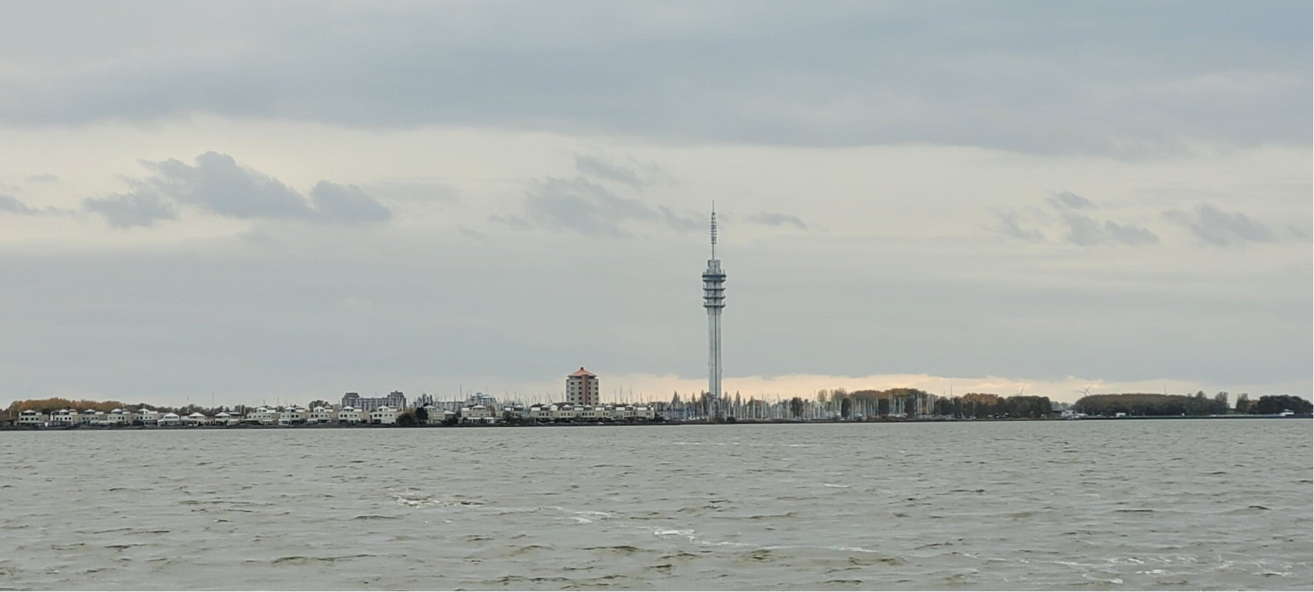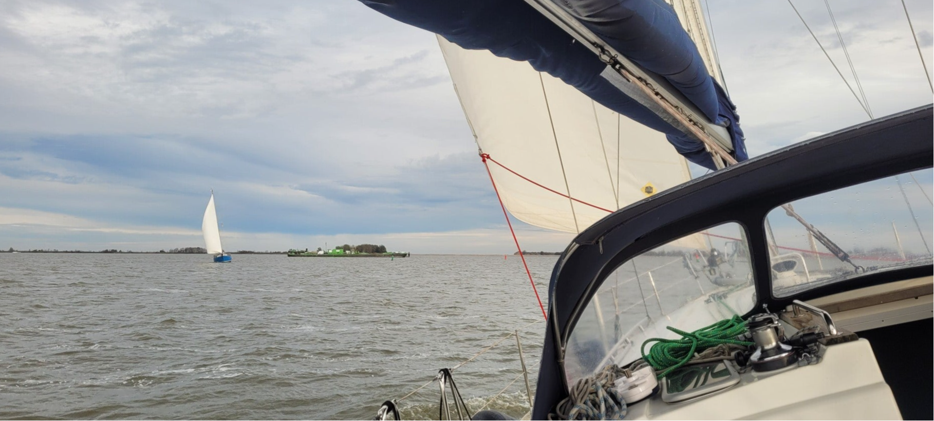 Vandaag schijnt er bij het opstaan een lekker zonnetje. Na wederom een goed zondags ontbijt, maken we ons klaar voor vertrek. Vandaag gaan we op weg naar Lelystad, waar we in onze vertrouwde Houtribhaven een winterligplaats hebben kunnen regelen. Rond half twaalf gooien we de trossen los en draaien het IJsselmeer op. We hijsen de zeilen en de motor kan uit. Altijd een mooi moment. Het valt ons op dat we het grootzeil niet helemaal lekker strak krijgen en dan realiseren we ons dat we nog vergeten zijn om te kijken wat dat lijntje boven aan het zeil te betekenen had. Inmiddels vrezen we dat het niet het bewuste elastiek is, maar dat het grootzeil bovenin kapot is. Er zit in het voorlijk (de rand bij de mast) een koord. De zoom waar dit in zit lijkt versleten en het koord is los gegaan en wappert in de wind. Het draait zich ook een beetje om de verstaging, waar we niet zo blij mee zijn. Voor nu maar niks aan doen, want verder er omheen draaien kan niet. Dus lekker zeilen en hopen dat het zeil straks zonder problemen gestreken kan worden.