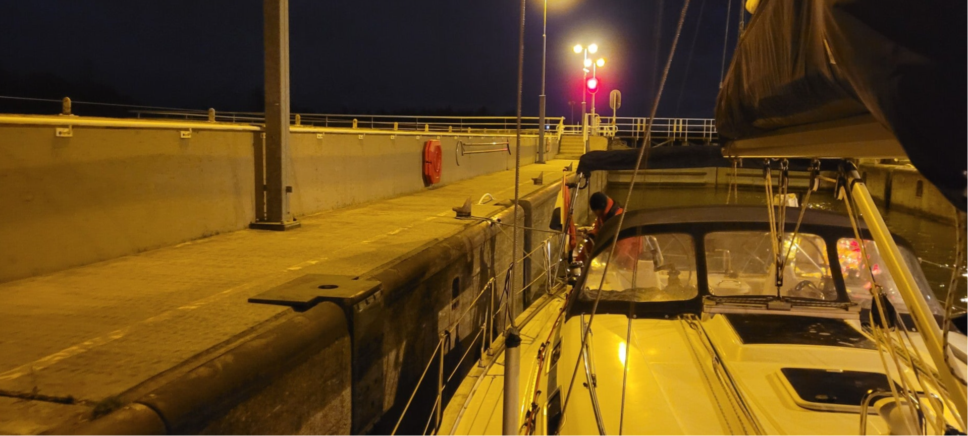 In de kom voor de sluis strijken we de zeilen, daarbij zien we een lijn of elastiek boven aan het grootzeil zitten. We vermoeden dat dit mogelijk het elastiek is waarmee we de grootzeilval vastzetten aan de lazybag om getik tegen de mast te voorkomen, al vragen we ons wel af hoe deze daar dan terecht is gekomen. Morgen bij daglicht maar eens beter bekijken. Om even voor zessen varen we de sluis in waar we aan hoger wal gaan liggen. We zijn de enige boot. Het schutten gaat soepel. Renata legt eerst de achterlijn om een bolder en geeft deze aan Paul Michèl. Vervolgens legt ze de voorlijn om een andere bolder. Niet veel later varen we de sluis weer uit en hijsen opnieuw de zeilen. In het donker zetten we onze tocht voort naar Medemblik.