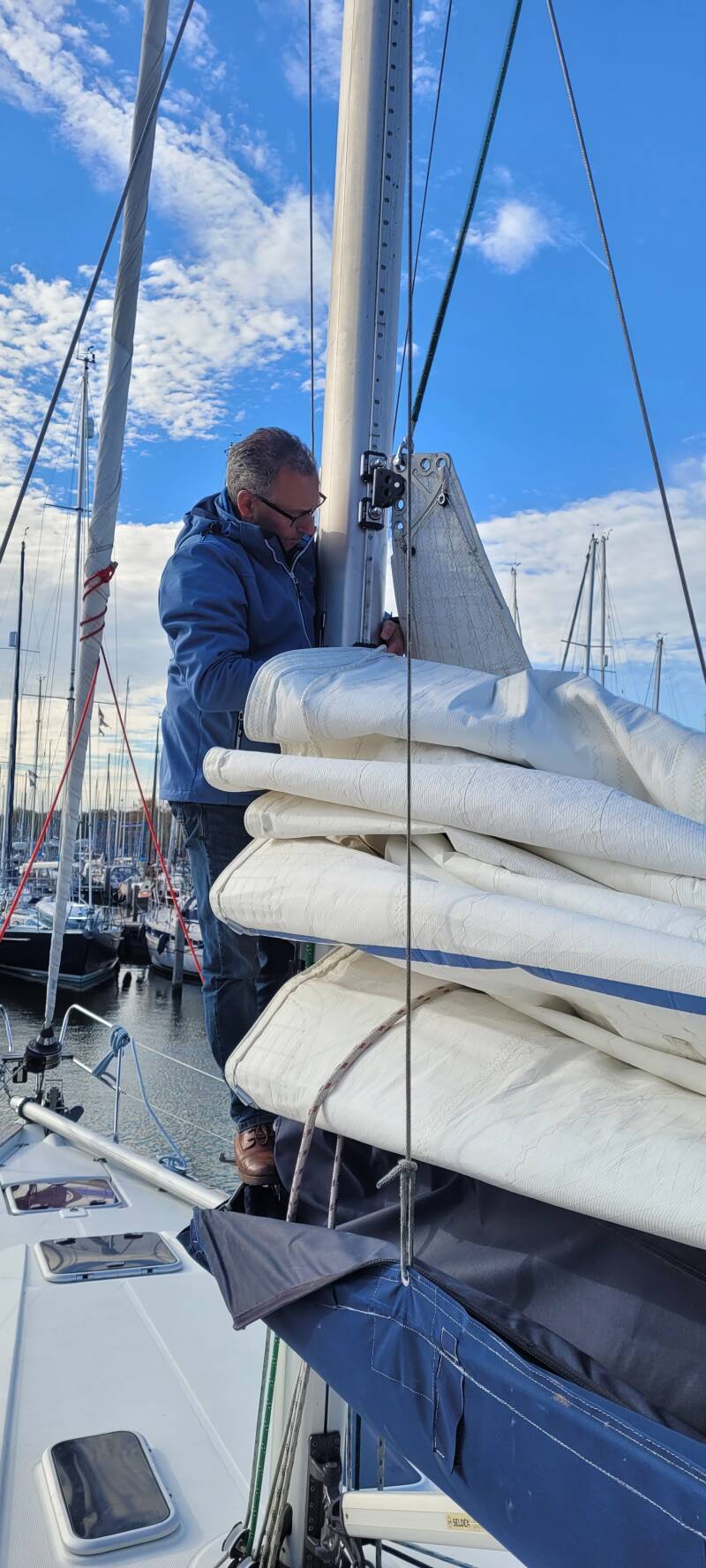 We starten deze klus door bij de mast alle leuvers die aan het grootzeil zitten los te halen van de sledes die in de mast zitten. En natuurlijk maken we ook de reeflijnen meteen los. De reeflijnen zorgen ervoor dat we het zeil kunnen verkleinen bij hardere wind en we dan niet overtuigd zijn en dus comfortabeler kunnen zeilen. Als we ook aan de andere zijde bij de giek het grootzeil en de reeflijnen hebben losgemaakt ligt het zeil los in de lazybag (die blauwe hoes die onder het zeil op de giek ligt). Om een beetje verband in het geheel te houden binden we een lijn om het grootzeil heen. Zo hebben we ook meteen wat meer houvast. Met vereende krachten trekken we vervolgens het grootzeil uit de hoes richting de punt van de boot. De boot is gelukkig lang genoeg om het zeil op deze manier aan dek te leggen. Vervolgens moeten we dan nog de zeillatten uit het zeil verwijderen. De ongeorganiseerde bende die overblijft halen we wiebelend op het vingersteigertje van boord. Het zeil is erg zwaar, dus telkens als we het op de kar willen leggen, duwen we de kar opzij. Uiteraard zijn wij niet voor één gat te vangen, dus uiteindelijk belandt het zeil op de kar en kunnen we naar het parkeerterrein rijden, waar we het helemaal uit kunnen leggen en netjes opvouwen. We zorgen ervoor dat het deel dat gerepareerd moet worden aan de buitenkant zit en rijden meteen naar de zeilmaker hier in Lelystad. We willen namelijk doorzeilen in de winter, dus we hebben het zeil binnenkort weer nodig.