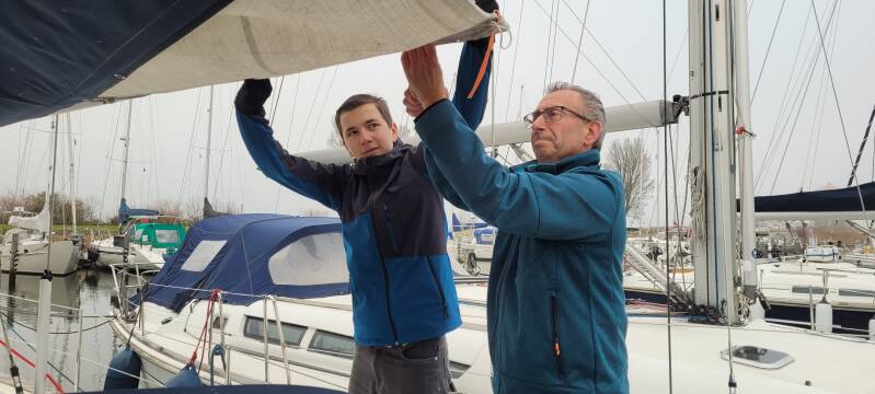 Na een paar weken is het zeil weer gerepareerd en haalt Paul Michèl het op bij de zeilmaker. En zo gingen we afgelopen woensdag gedrieën op weg naar de boot. Het beloofde een windstille en droge dag te worden en dat bleek het gelukkig ook te zijn. Het was alleen wat frisjes aan de vingers. Met wat extra handjes van Maxim konden we de klus vrij snel klaren. Het grootzeil is weer klaar voor gebruik!