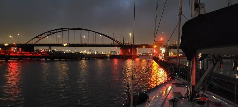 Op het Buiten-IJ houden we het opkruisen voor gezien. Tussen de betonning en de grote vaart is dit niet heel praktisch. Dus we starten de motor, rollen de fok in en strijken het grootzeil. Om tien voor half zes meren we af aan het kunstwerk voor de Schellingwouderbrug. Het is inmiddels al flink donker. Met nog een kleine drie kwartier te wachten gaan we binnen onszelf en de spaghetti carbonara opwarmen. Dan eten we maar alvast en hebben we straks de avond aan onszelf.