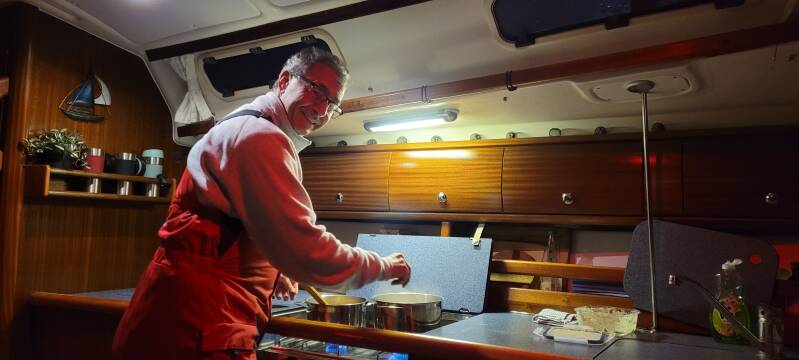 Een lekker maaltje mag natuurlijk ook niet ontbreken en vervolgens een relaxed avondje op de bank met het kacheltjes dat snort. We genieten enorm van ons fijne schip en de tijd samen.