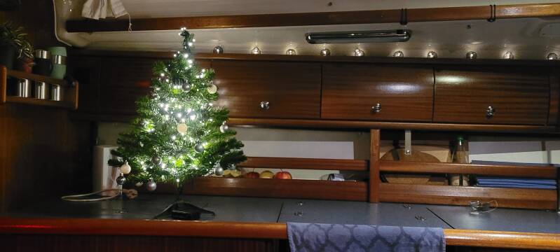 We gaan naar binnen en de kachel gaat aan. Renata warmt haar laatste hapjes spaghetti nog even op. Daarna ruimen we de tafel af en de keuken aan kant en tuigen onze kerstboom op, want die mag niet ontbreken aan boord. Ook buiten hebben veel boten al feestverlichting hangen. Een heerlijk sfeertje. Daarna is het tijd om op de bank te kruipen met een warme kop thee en een film. Vanavond is ook de primeur van de nieuw gebouwde douche. Voor wie zich na het bekijken van het klusfilmpje misschien nog afvroeg of die douche wel echt werkte, dat kunnen we nu meer dan bevestigen. Het werkt top allemaal! Ruimte genoeg om je lekker te bewegen, het douchegordijn houdt de deur droog en probeert niet opdringerig aan je te gaan plakken, het water is heerlijk warm, het spatten valt mee en de pomp om het water af te voeren doet ook prima zijn werk. Na nog het winterdekbed tevoorschijn te hebben gehaald en een warme kruik te hebben gemaakt, gaan we warmpjes de nacht in.