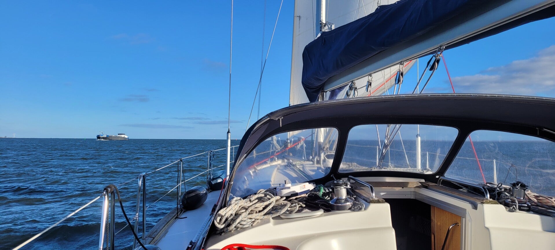 Omdat de wind best wel stevig is, hebben we twee riffen in het grootzeil aangebracht. Op deze manier kunnen we toch comfortabel varen en zijn we niet overtuigd. En daar zijn we blij mee, want de wind is een dikke 20 Kts (windkracht 5 à 6 Bft). We nemen de laatste doorgang door de dijk richting Amsterdam. Met fok en gereefd grootzeil gaan we dan gemiddeld nog een knoop of zeven. Het komt goed uit dat we twee riffen in het grootzeil wilden, want we zien dat de reeflijnen niet helemaal goed bevestigd zijn. De ene reeflijn zit bij het voorlijk (bij de mast) op het eerste rif en bij het achterlijk (bij het puntje van de giek) op het tweede rif en de tweede reeflijn precies andersom. Even niet goed opgelet bij het terugplaatsen van de reeflijnen, het is nog even wennen.