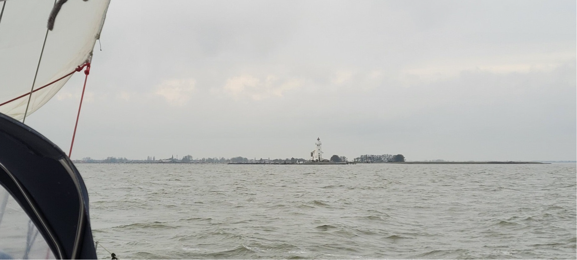 De wind komt uit zuidwesten, dus dat betekent opkruisen richting Amsterdam. Het eerste rak gaat recht op Het Paard van Marken af, de vuurtoren op Marken. We sturen lekker zelf, maar dat is best wel fris aan de handen. Het helpt niet mee dat de handschoenen in de sluis nat zijn geworden, doordat er een lijn in het water viel. De handschoenen zijn dus nog wel een aandachtspuntje voor het winterzeilen. Om op te warmen, maakt Paul Michèl een snelle warme hap klaar.