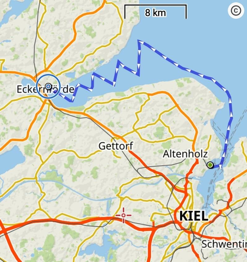 Een mooie zeiltocht naar Eckernförde in de hoop dat het daar gezelliger is en we wel een accu kunnen scoren.