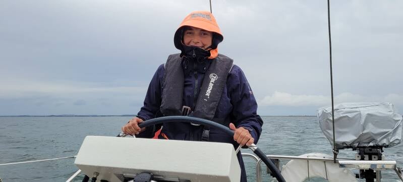 De zon van gisteren heeft plaatsgemaakt voor wolkenvelden. Er trekt een front onder ons langs, waar wij ook wat regen van pakken. Dus de zeiljassen moeten aan.
