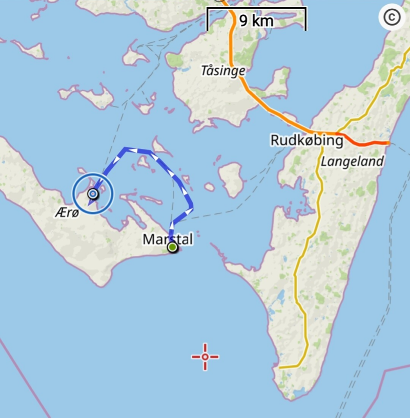 Terug in de haven vullen we de watertank bij. Om waterverspilling tegen te gaan, moet je constant een hendel ingedrukt houden tot de tank vol is. Aan het begin van het havengebied gooien we eerst de dieseltank weer vol. Je weet immers maar nooit wat je tegenkomt en hoe lang je de motor moet gebruiken. Naast ons is net de veerboot aangekomen en inmiddels weer vertrokken. Die komen we dus hopelijk binnen de smalle vaargeul niet meer tegen. Rond een uur of twee verlaten we de haven van Marstal op naar Ærøskøbing om het eiland Ærø verder te ontdekken. Dit schijnt een heel sfeervol plaatsje te zijn. De haven schijnt net zo druk te zijn als die in Marstal. Hopelijk komen we vroeg genoeg aan om nog een plekje te vinden.