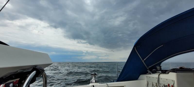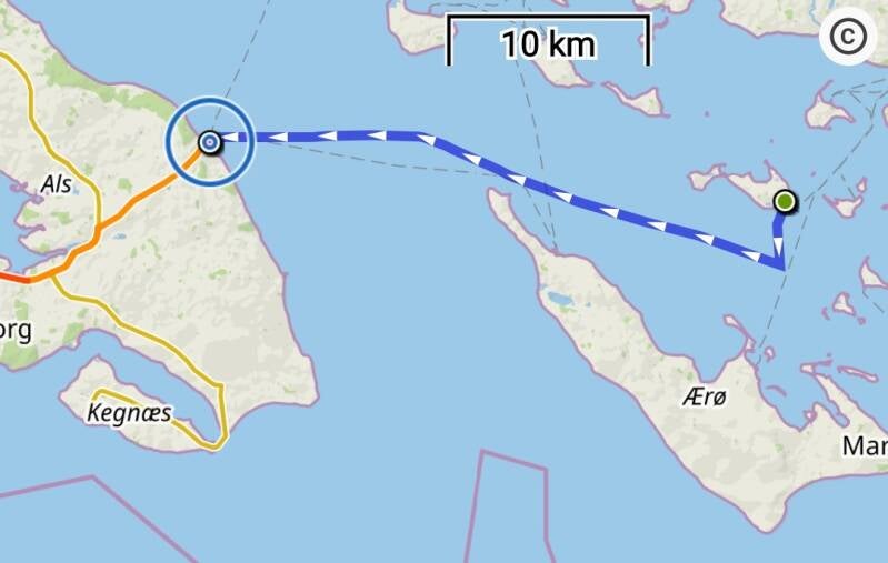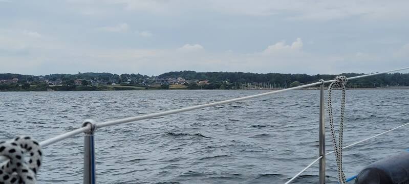 Het eerste rak gaat terug richting Ærøskøbing. Hierna kunnen we met gemak de punt boven het eiland Ærø ronden. Aan de stuurboordzijde pakken zich dikke zwarte wolken samen, waar grote plensbuien uit naar beneden komen. We hopen dat we deze wolken net kunnen ontlopen en jawel die gaan aan ons voorbij. Jammer genoeg begint de wind wel af te nemen. Meer dan een windkracht 2 is het niet meer en in combinatie met de golfslag komen we niet vooruit en zijn we eigenlijk ook stuurloos. Zeilen is waar de wind je brengt, maar gelukkig zit er ook een motor op de boot, want er zit niet anders op, de motor moet weer aan. Het fok rollen we op en we houden het grootzeil er nog een tijdje bij. Dit voegt eigenlijk niets toe, dus we besluiten deze ook maar te strijken. Het eiland Als ronden om bij Dyvig te komen, betekent nog zeker 15 mijl op de motor verder, want zoals het windbeeld nu laat zien, draait de wind mee om het eiland, zodat - waar je ook vaart - je de wind tegen hebt. We zijn enigszins teleurgesteld in de voorspelkracht van onze windapps, want zo zag het er van te voren toch echt niet uit.
