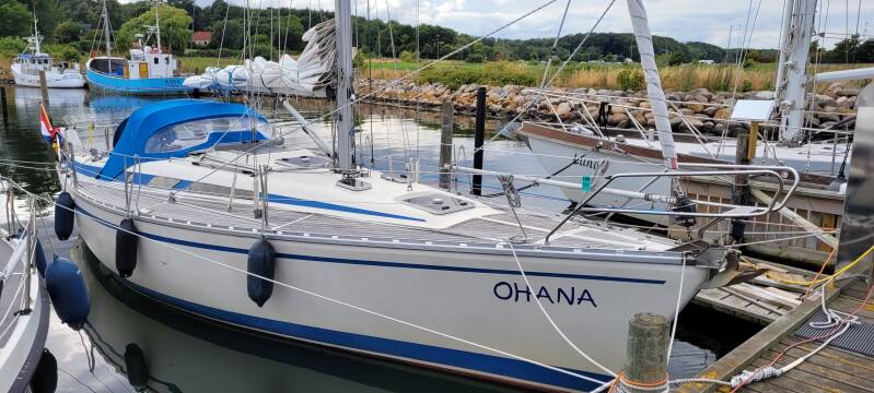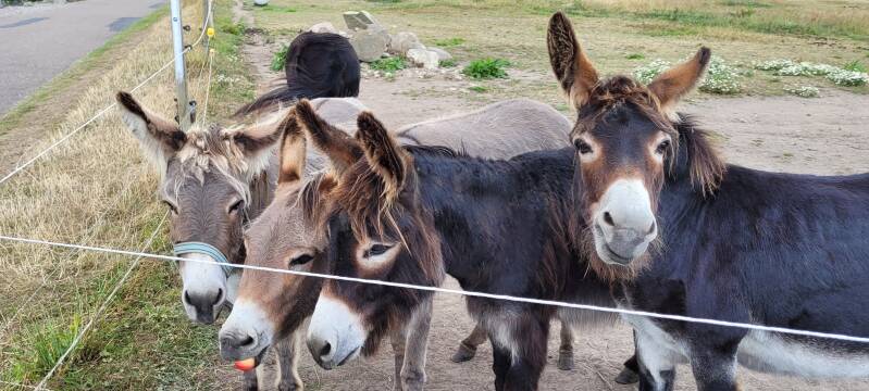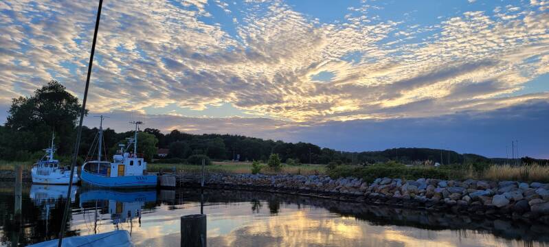 We besluiten uit te wijken naar Fynshav aan de oostkant van Als. Er is niet veel informatie over te vinden, dus dat belooft niet heel veel, maar vanaf het water ziet het er best gezellig uit. Dit is met een uurtje motoren wel te doen. De haven ziet er niet zo vol uit, dus een plekje moeten we wel kunnen vinden. En dat blijkt ook zo te zijn. Nog voldoende boxen over om uit te kiezen. We vinden er eentje op maat en leggen daar rond half drie aan. We eten onze verlate lunch op en relaxen wat. Als het zonnetje weer een beetje door de wolken breekt, gaan de schoenen weer aan voor een rondje door het boven gelegen dorpje. En eigenlijk kunnen we hier heel kort over zijn. Het is niks en het wordt niks. Brede rechte en kale geasfalteerde straten, tuinen met - een enkele uitzondering daargelaten - alleen struiken en gras, een buurtsuper, een pizzaboer en een snacktent. Een Fransman met haast vraagt ons hoe hij bij de veerboot komt, wij snappen het wel, die wil hier zo snel mogelijk weg. Gekheid, maar het is een saaie bedoening. Op een weiland met een paar ezeltjes na, is het enige wat er gezellig uitziet het naast de haven gelegen strandje. Als de zon schijnt is het hier waarschijnlijk prima toeven. Maar goed, je kunt niet alles hebben, wij lopen terug naar de boot en gaan daar de blog schrijven (snel klaar vandaag! 😉) en relaxen. Wij komen onze tijd wel door!