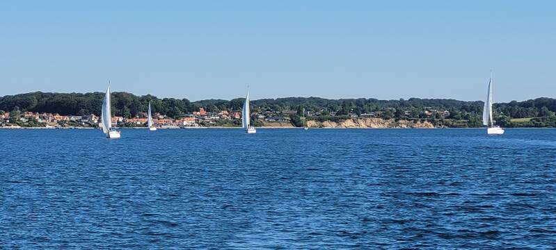 De rakken gaan steeds over de landsgrens heen, dan varen we weer in Denemarken en dan weer in Duitsland. Uiteraard zijn we niet zo gek om iedere keer de landsvlag te verwisselen. Hier wachten we mee tot we volledig op Duits grondgebied zijn en het Deens vaarwater helaas weer achter ons hebben gelaten. Zodra we dichter in de buurt komen van Maasholm wat aan het fjord van Schleimunde ligt, liggen er volgens de waterkaart rotsen in het water. Om geen onnodig risico te lopen, omzeilen wij deze, maar even verderop varen tientallen zeilboten die op de AIS gewoon over de rotsen heen lijken te varen. Eén keer aan de grond lopen op vakantie, is wat ons betreft voldoende, dus liever niet ook het risico om op een rots varen.
