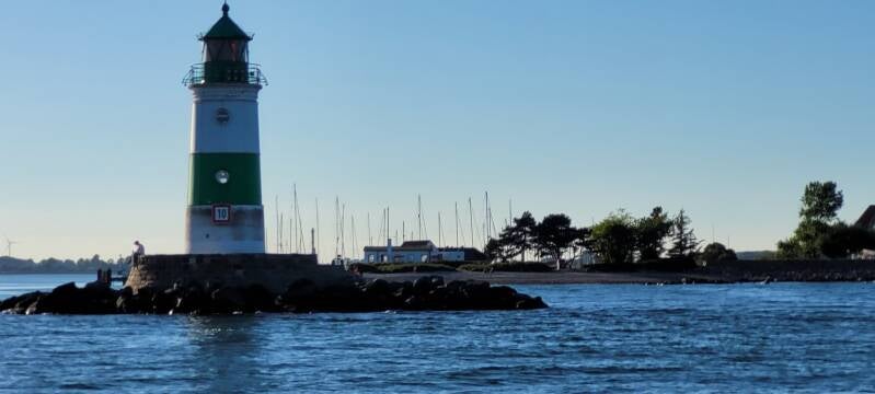 Na het eten strijken we het grootzeil en gaan op de motor verder. Op de hoek van de fjord ligt een schattig haventje, met een vuurtorentje op de hoek en met een klein strandje. Dit is het haventje Schlei. Op deze tijd van de dag uiteraard helemaal vol, maar zeker de moeite van het onthouden waard. Wij varen tussen de betonning door naar de haven van Maasholm (480 ligplaatsen). Om ons heen ondieptes en land mooi verlicht in de avondzon.