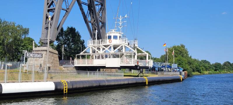 Al met al zijn we een aantal uren vertraagd en moeten we gaan rekenen of we voor zonsondergang de sluis bij Brunsbüttel nog wel kunnen halen. Voorlopig eerst maar varen, dat geeft een klein beetje verkoeling. Ook de tarp hangen we op, om nog een beetje schaduw te kunnen vangen. Paul Michèl maakt onder het varen nog een keer een heerlijke appelmoes van Spaanse appels. Voor het gebruik van de staafmixer zetten we de generator even in de kuip. Geweldig dat dit zo kan. We passeren Rendsburg en het Gieselaukanaal. Deze reis hoeven we niet achter de dukdalven om aan de kant te gaan voor passerende vrachtschepen. De enige twee die in onze buurt moeten passeren passen vrij ruim langs elkaar heen.