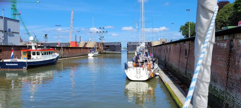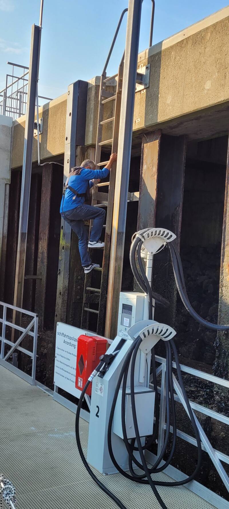 Bij Brunsbüttel hebben we mazzel, omdat we meteen door kunnen varen de sluis in, daar hoor je zat andere verhalen over. Verder is er weinig positiefs over deze sluis te melden. Het is een oud ding en de drijvende steigers maken het gereedmaken voor het schutten geen hobby. Omdat deze steigers net iets hoger liggen dan de waterlijn moet je van flinke hoogte springen. Als de boot eenmaal vastligt aan de ringen op de steiger is het wel makkelijk, je hoeft geen lijnen te laten vieren.