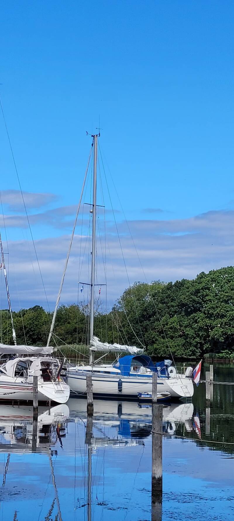 De volgende ochtend worden we vroeg gewekt door de eerste veerboot die aankomt. Als wij klaar zijn voor vertrek naar Dyvig, worden we allervriendelijkst geholpen om van lager wal weg te komen uit de haven. Buiten de haven is het met een goede windkracht 4 fantastisch zeilweer. De zwarte wolken die samenpakken aan onze stuurboordzijde kunnen we gelukkig op afstand houden. Helaas neemt de wind sterk af en blijkt ook nog om het eiland Als mee te draaien, constant vol tegen dus. Enigszins teleurgesteld in de voorspelkracht van onze windapps wijken we uit naar Fynshav. De haven is niet zo vol, maar dat blijkt ook een reden te hebben. Er is hier werkelijk helemaal niets te beleven, het dorpje is niks en zal ook nooit iets worden. Wij maken het ons maar gemakkelijk op de boot en maken plannen voor morgen. Via ZeilNoord horen we van Mariëtte en Tjalling van de Salina dat zij ook onderweg zijn naar Dyvig.