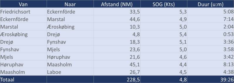 Afstand door het water: 228,5 NM; Duur: 39 uur en 26 minuten; Gemiddelde snelheid: 4,8 Kts