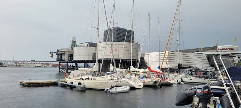 Niet veel later komt het Olje Museum in zicht en varen we dus recht op Gjestehavn Børevigå af waarop ons oog is gevallen. Vanaf daar loop je zo het centrum van Stavanger in. Als we dichterbij komen blijkt de haven al erg vol te liggen. Boven op het dak van het Olje Museum roept iemand die ons al een tijdje filmt of fotografeert: 'Zo, ver van huis!'