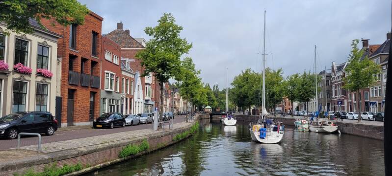Het is in Leeuwarden oppassen geblazen met de bomen langs de kade. Een Engelsman bij ons in de buurt haakt bij het aanleggen zijn mast bijna in een boom. Wij leggen aan de overkant aan en lopen naar de Jumbo voor verse broodjes en beleg. Op de boot gaan we uitgebreid ontbijten met een lekker eitje erbij.