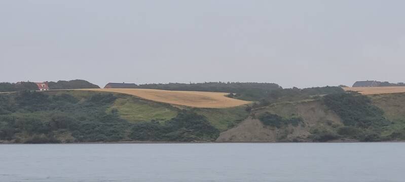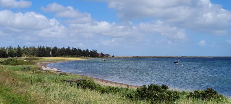 In Lemvig Marina zien we de BBQ staan, die we gisteren op het water roken. Na deze haven begint een vakantiedorp. Het staat hier vol met vakantiewoningen. Het terrein is flink geaccidenteerd, dan weer flink klimmen en vervolgens weer een steile afdaling. Als we bovenop bij een bankje even een korte pauze inlassen, zien we bij een paar golfbrekers beneden een drietal zeehonden. Twee liggen op de golfbrekers, één had zin in een nieuwe ervaring en ligt op een surfplank te chillen. Een koddig gezicht!
